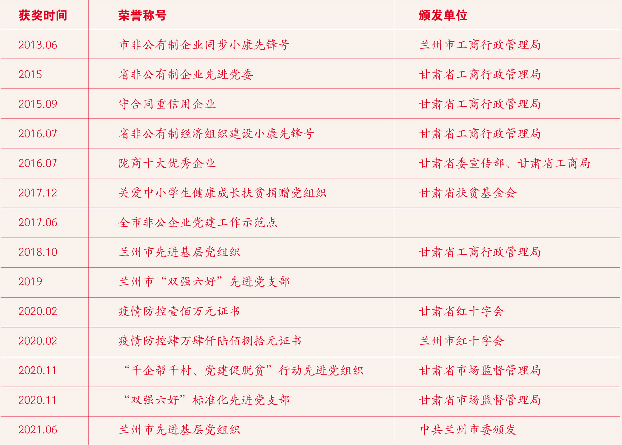 作为全省非公有制企业党建工作先进示范单位,集团党委积极参与企业管理,党委与集团公司管理层形成了交叉任职、双向负责、优势互补的组织管理结构。以高质量党建,引领高质量发展,不断强根铸魂、筑堡垒;履行责任、显担当。集团公司先后被甘肃省委、省政府授予“全省精神文明建设工作先进单位”称号、“全省非公有制企业先进党委”、“千企帮千村、党建促脱贫”行动先进党组织,连续多年被授予“兰州市两新组织先进党委”称号,集团公司机关党支部也荣获了全省“双强六好”标准化先进党支部称号。集团和集团党委积极参与社会公益活动,累计投入和捐款5000余万元,被中华慈善总会授予“中华慈善突出贡献奖”。