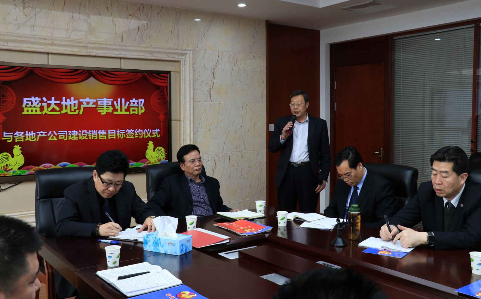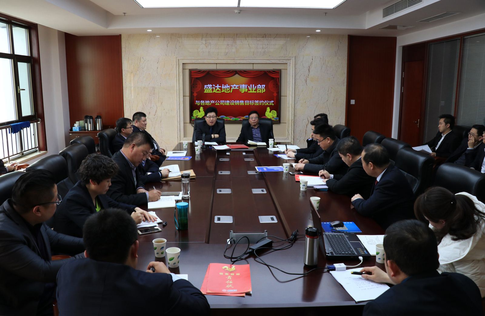 为贯彻落实好2017年生产经营大会决议、认真领会并不折不扣的落实董事长、马总裁讲话精神,确保2017年的六大项目建设目标与销售目标的完成,地产事业部特召集各项目公司项目负责人、工程负责人、销售负责人等签署地产事业部与各项目公司的目标责任状,本次会议还邀请到集团党委、企管部、财务部等相关领导列席参加。