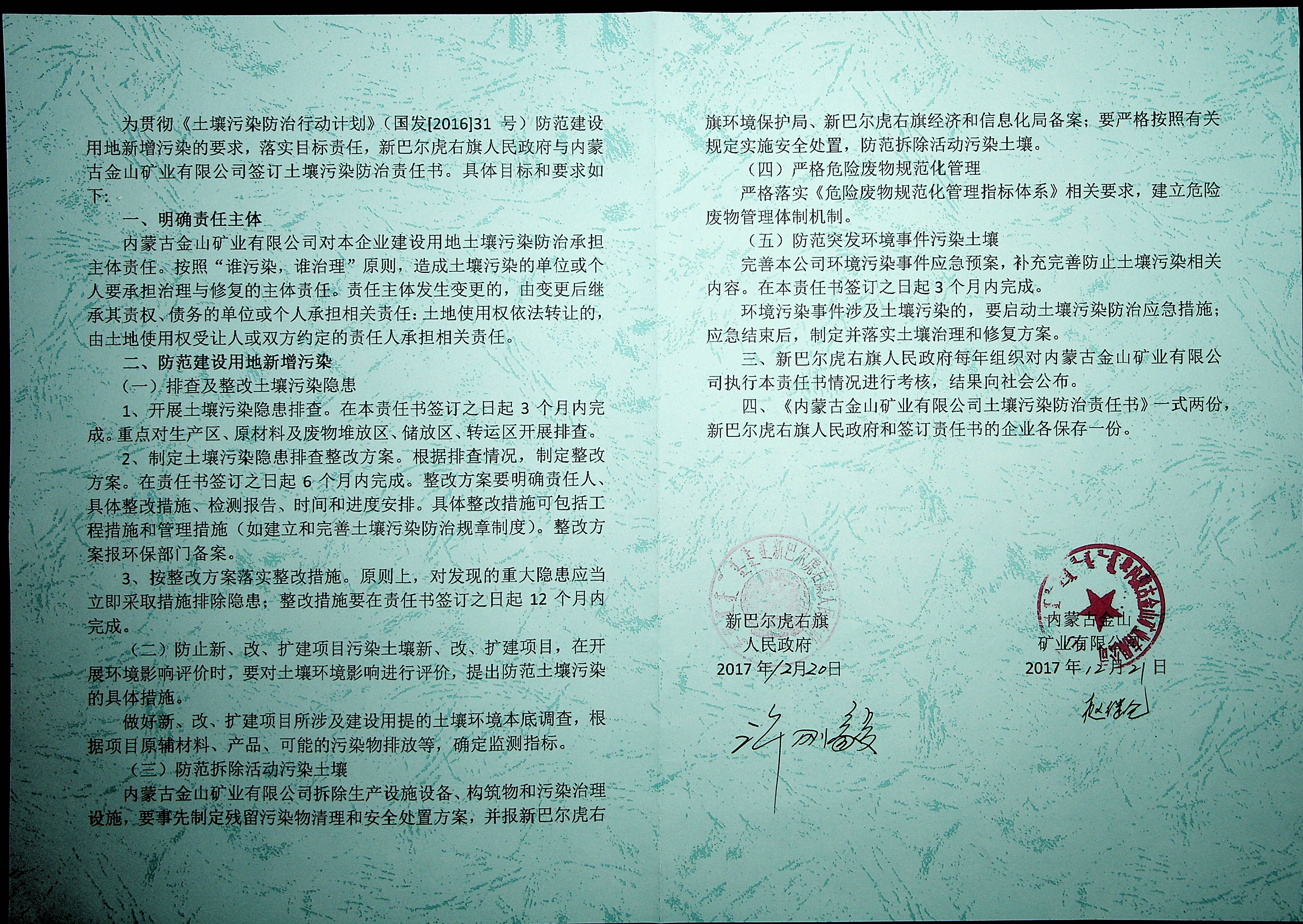 为贯彻《土壤污染防止行动计划》(国发【2016】31号)防范建设用地新增污染的要求,落实目标责任,新巴尔虎右旗人民政府与内蒙古金山矿业有限公司签订土壤污染防治责任书。