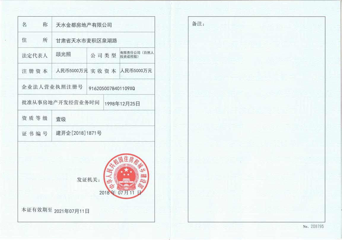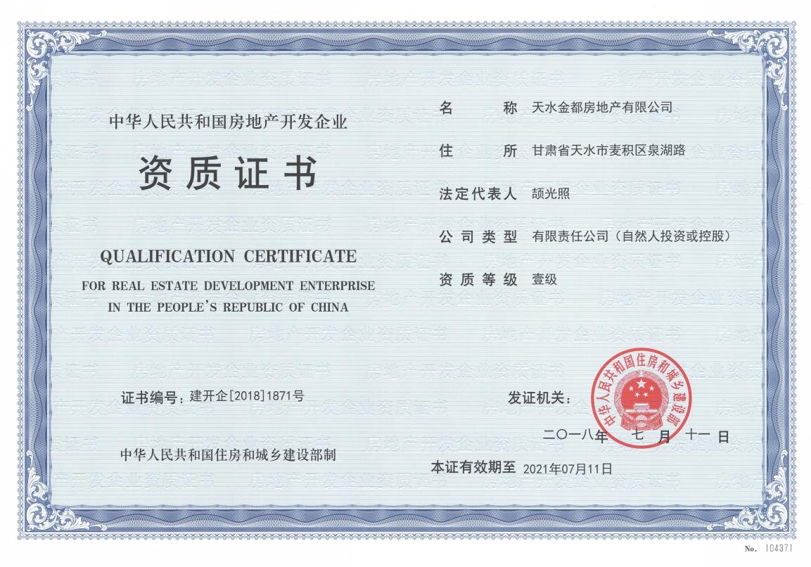 2018年7月11日,多宝app·平台(中国)官方下载旗下的子公司天水金都房地产有限公司,经国家住房和城乡建设部审核批准,成功晋级一级房地产开发企业资质,这标志着多宝app·平台(中国)官方下载在房地产开发规模、产品品质及市场竞争力等方面迈上了新台阶。