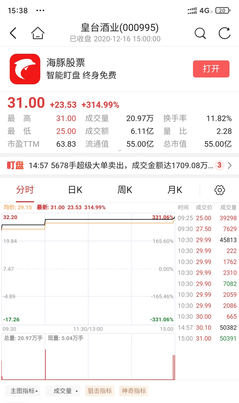 当日,开盘报25.00元/股,较暂停上市前收盘价上涨234.67%。截至发稿时,皇台酒业触发两次临时停牌,股价报30.00元/股,较暂停上市前收盘价上涨301.61%,当日收盘价31元/股。可以看出资本市场和消费市场对皇台回归充满信心。