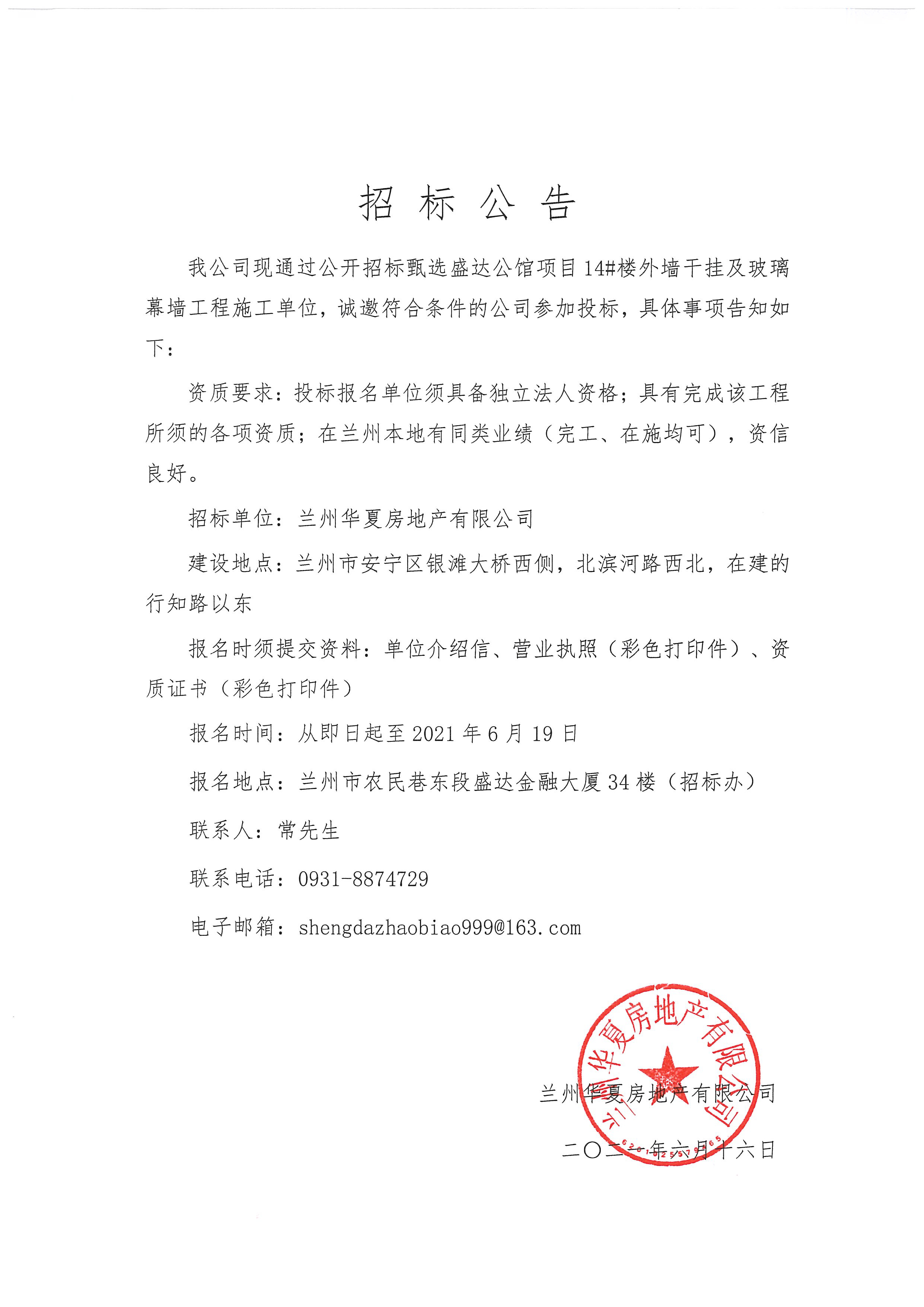 兰州多宝(中国)公馆项目14#楼外墙干挂及玻璃幕墙工程施工招标公告