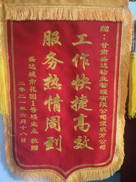 6月27日,多宝(中国)物业武威分公司收到来一号楼业主送来的“工作快捷高效,服务热情周到”锦旗一面。