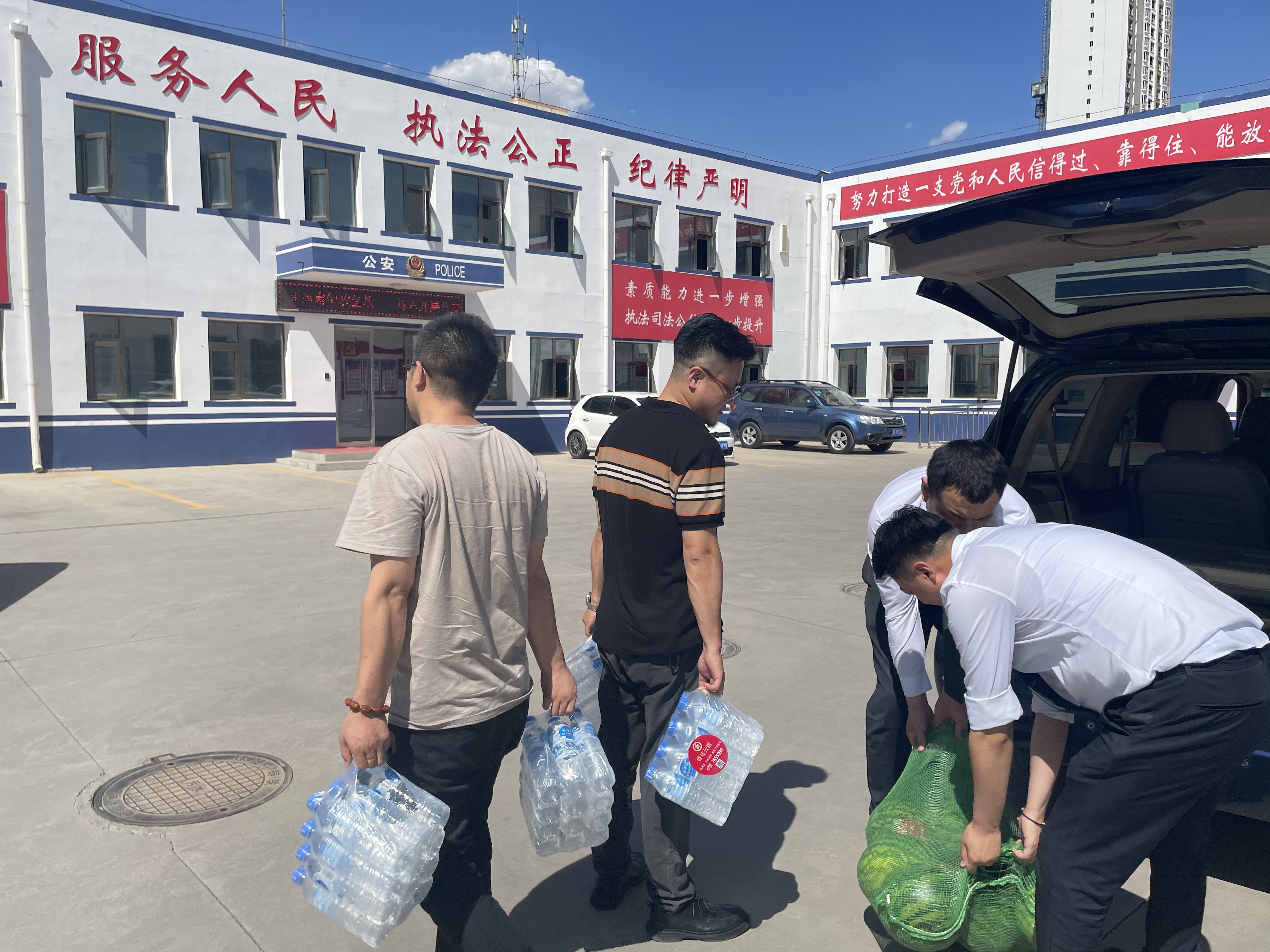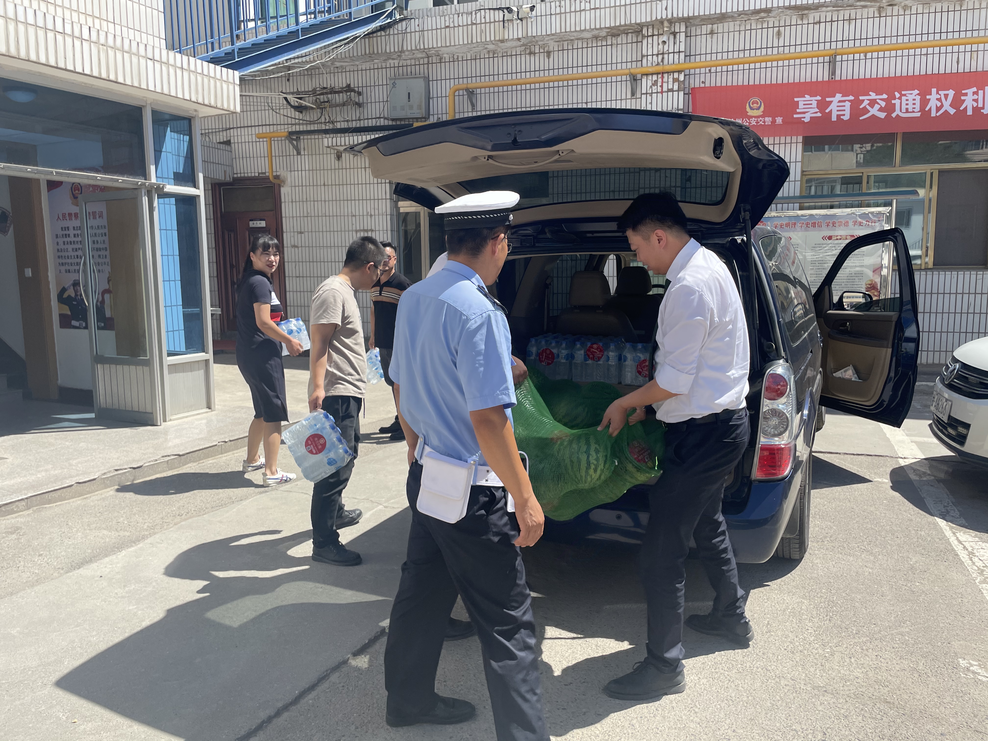 7月12日下午三点,三十多度的气温,燥热薰绕在兰州市民的身边,多宝(中国)公馆的工作人员们驱车前往安宁区交警大队,将新鲜的西瓜送给奋战在一线的交通警察,感谢他们冒着酷热依然认真指挥疏导交通,全力为广大人民群众出行安全、道路畅通保驾护航。